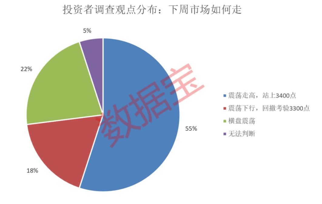 对于下周的大盘走势,多数投资者表示看好。其中,认为大盘将“震荡走高,站上3400点”的受访者占比55%;认为“震荡下行,回撤考验3300点”的观点比例为18%;认为“横盘震荡”的观点比例为22%。