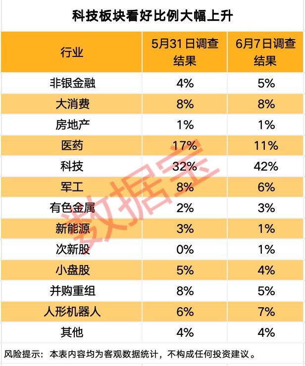 对于下周A股市场的潜力板块和方向选择,科技板块环比上涨10个百分点至42%,上涨最为明显;医药板块则大幅下降至11%,环比下降7个百分点。其余板块受访者看好比例变动不大。