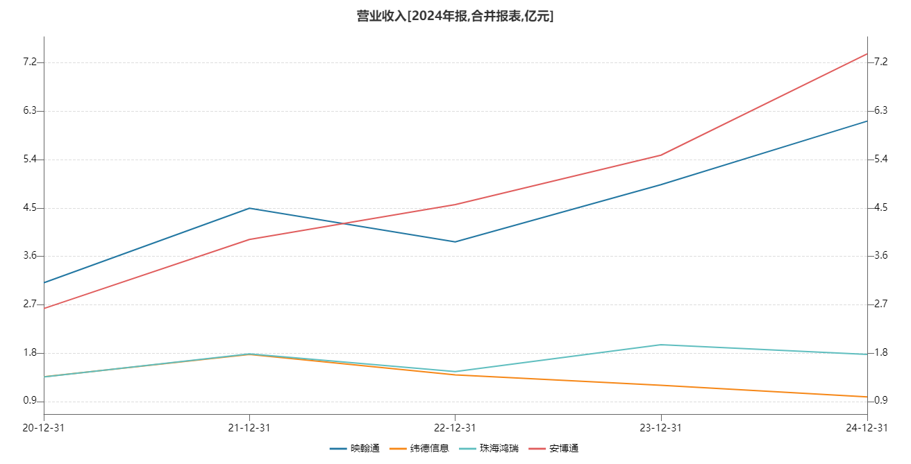 此外,纬德信息的营收走势也异于同业。由于行业龙头业启明星辰的业务规模常年高于30亿元,远超同行,因此我们将另外四家企业营收放在同一图像中观察其走势。可见,纬德信息与珠海鸿瑞营收同样与业内趋势相异,连年下滑,2024年分别录得0.98亿元、1.78亿元,成为垫底。而竞品映翰通和安博通的营收则一路高歌,达到6-7亿区间。