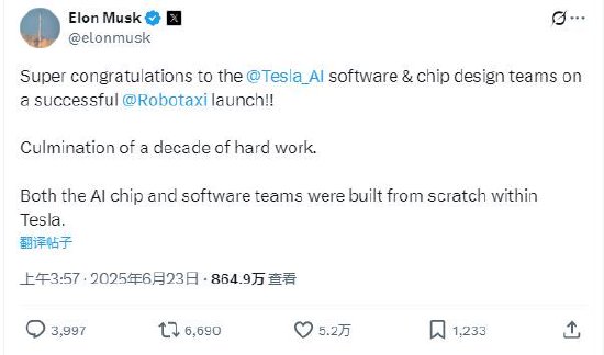 马斯克还在他的社交媒体平台X上发帖称:“超级祝贺特斯拉AI软件和芯片设计团队成功推出Robotaxi!!这是十年辛勤工作的结晶。AI芯片和软件团队都是在特斯拉内部从零开始组建的。”