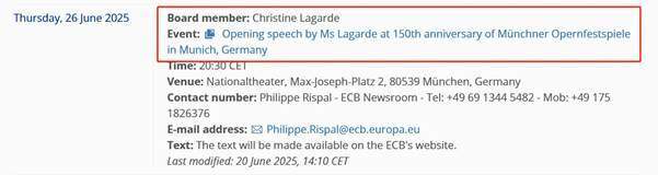 本周五02:30,欧央行行长拉加德将发表讲话,地点在德国慕尼黑。本次讲话是为了庆祝慕尼黑歌剧节150周年,拉加德做开幕致辞。考虑到本次活动与欧元区的经济关联不大,拉加德可能不会就利率路径、通胀、失业率等内容发表评论。本周一21:00, 欧洲央行行长拉加德将在欧洲议会经济与货币事务委员会举行的听证会作介绍性发言,地点在布鲁塞尔欧洲议会。6月9日,拉加德曾讲话称,“我们目前处于有利位置,欧元表现良好”。过去两周时间,欧元区的宏观经济没有明显变化,预计拉加德的讲话将延续一贯的乐观风格,大概率将对欧元产生利多提振。