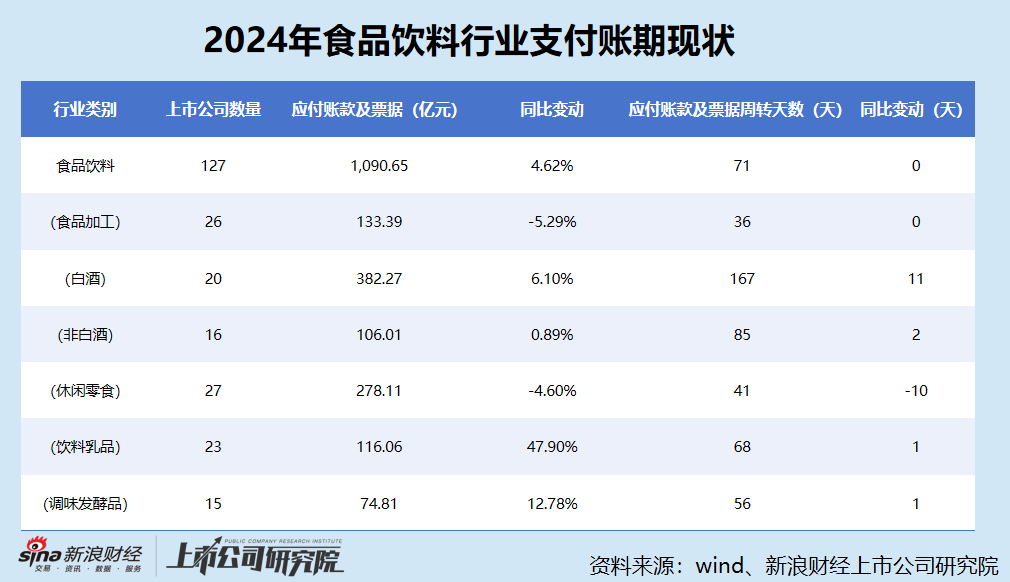 据Wind数据统计,截至2024年末,饮食行业共计127家上市公司(“A+B股”视作同一上市公司),营业成本总额5409.89亿元,应付账款及票据总额1090.65亿元,2023年末为1042.52亿元,同比增长4.62%。计算得出食品饮料行业2024年的支付账期为71天,较2023年持平,较2020年延长了15天。
