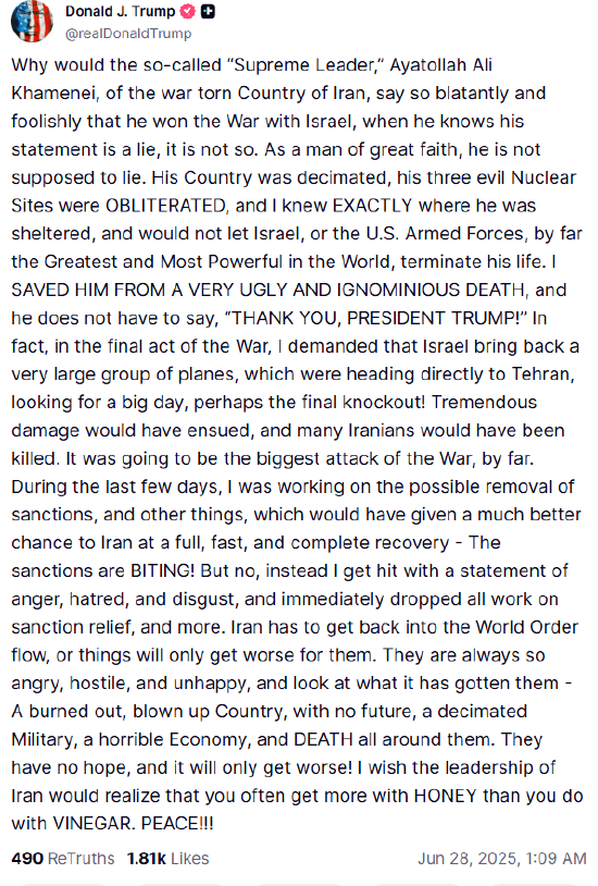 特朗普先是回怼哈梅内伊先前的发言,表示:“哈梅内伊明明知道自己在说谎,还要如此厚颜无耻且愚蠢地宣称他赢得了与以色列的战争。”