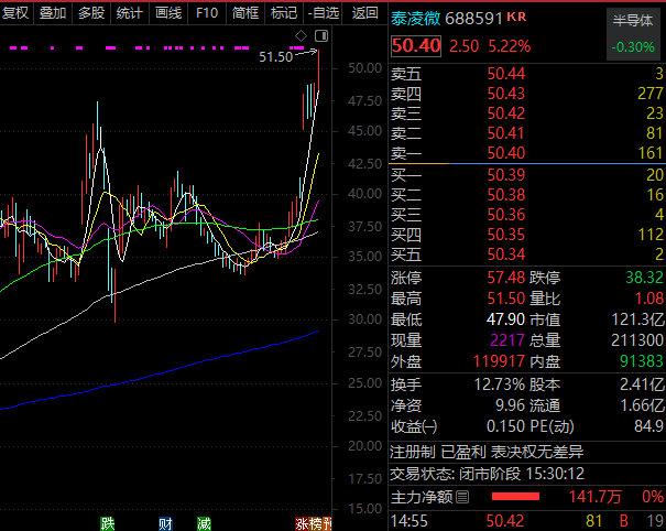 泰凌微在发布业绩预告后股价“20cm”涨停,今天更是时隔多年首次创出历史新高。截至收盘,该股报50.4元/股,市值121亿元。