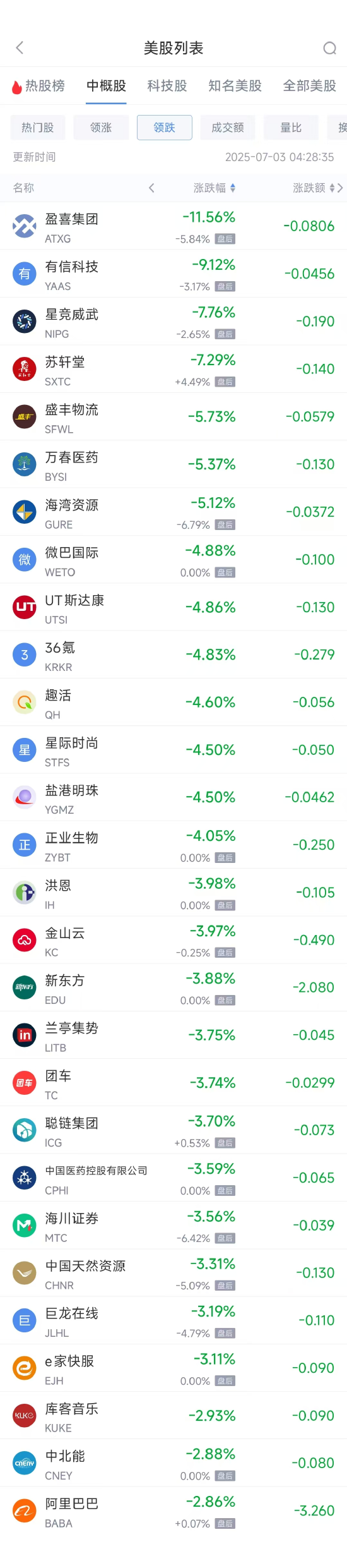 领跌中概股列表: