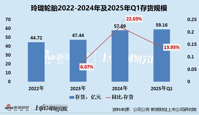另外2022年来,公司存货规模持续高增,截至2022-2024年年底及2025年Q1末,玲珑轮胎的存货规模分别为44.72亿元、47.44亿元、57.89亿元及59.16亿元。