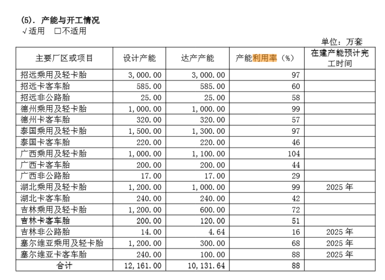 玲珑轮胎海外布局略显“着急”,特别在公司业绩、股价均不乐观的情况下,这对于公司的资金链考验极大。目前多厂区产能利用率不足60%。据公司2024年财报,玲珑轮胎公布的17个主要厂区或项目中,仅有6个厂区或项目产能利用率超在70%以上。