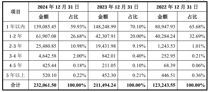 在应收账款余额整体规模增长的同时,电科蓝天1年以上应收账款余额也在增长。通过电科蓝天提供的数据计算可知,2022年至2024年,电科蓝天1年以上应收账款余额分别为4.23亿元、6.33亿元、9.30亿元,分别占当期应收账款余额的34.33%、29.93%、40.07%。