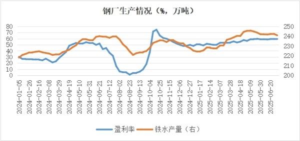 在经历了原料端大幅下挫,尤其是碳元素大幅走弱之后,钢厂利润不降反升。钢联数据显示,截止到5月底,247家钢厂盈利率为58.87%,同比增长11.48%,而到6月底,钢厂盈利率继续回升至59.31%,同比仍增长38.38%;钢厂利润难降,铁水也居高不下,截止到6月底,247家钢厂日均铁水产量达242.29万吨,同比增长1.19%。由此便形成产业链内部由前期需求坍塌、供应过剩形成的负反馈进而转化为利润再平衡之下的正反馈,即钢厂利润高位――铁水居高不下――原料需求强化――原料价格拉涨――成本支撑巩固。而这轮正反馈,我们认为在钢厂利润没有出现明显下滑之前,仍将维持良性循环。