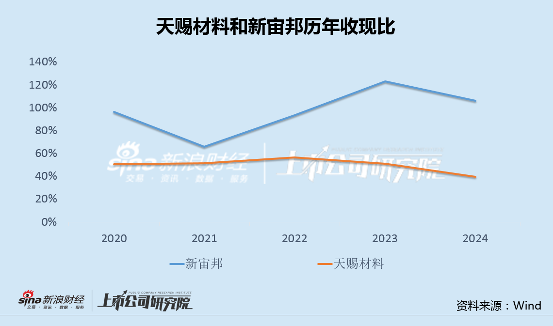 相比业绩,资金情况更令人担忧。数据显示,天赐材料收现比长期在50%以下,并仍处于下滑趋势,明显低于新宙邦等可比公司。
