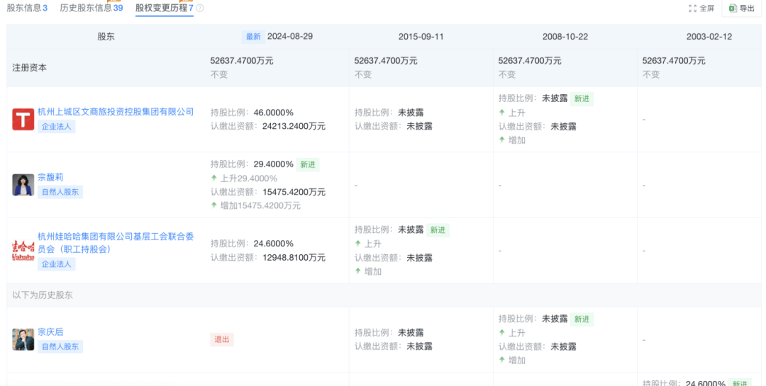 此外,宗庆后退出股东行列,杭州娃哈哈集团有限公司由宗馥莉、杭州上城区文商旅投资控股集团有限公司、杭州娃哈哈集团有限公司基层工会联合委员会(职工持股会)3名股东共同持股。其中,宗馥莉持股比例为29.4%。