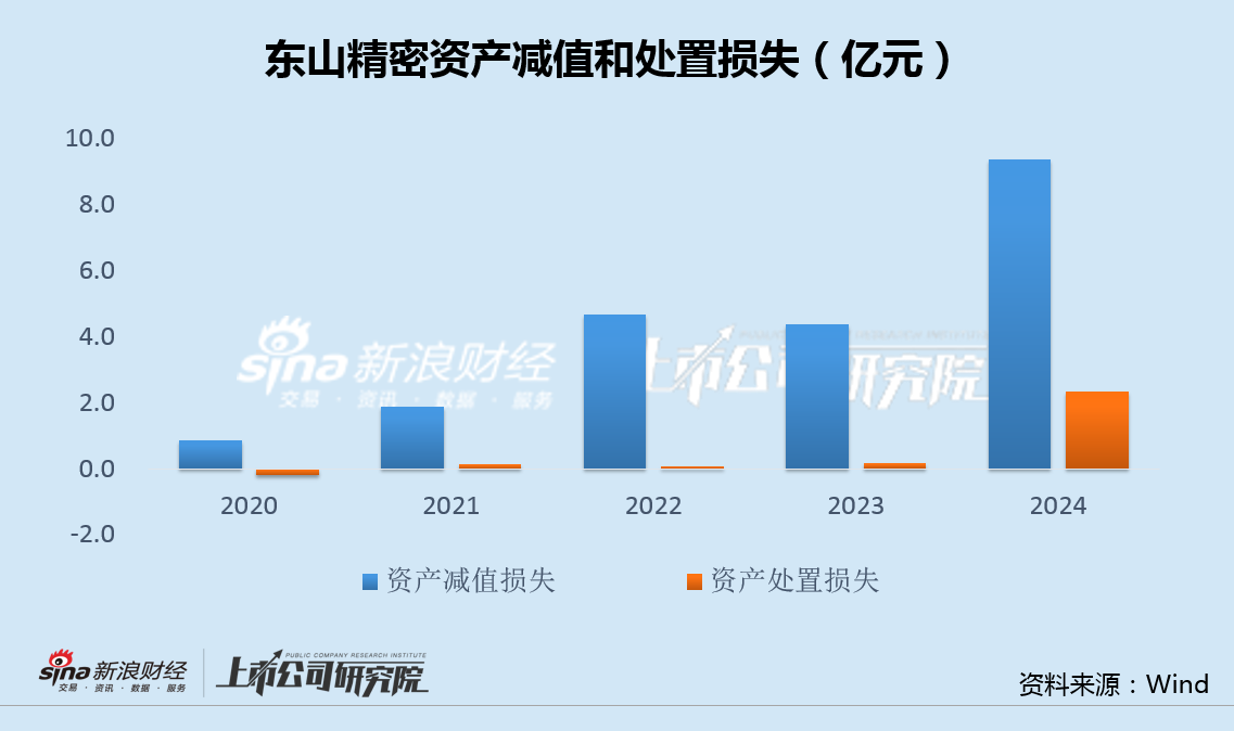 值得注意的是,随着业务领域的不断扩展,东山精密存货跌价损失、固定资产减值损失和商誉减值等资产减值损失从2020年的0.85亿增加到2024年的9.39亿,4年增加超10倍。此外,2024年公司因资产处置还损失了2.35亿。