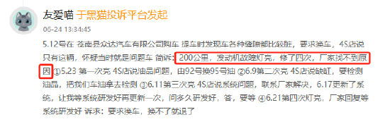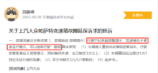 本月,黑猫投诉收到不少消费者对一汽大众变速箱故障问题的投诉。其中一位消费者5月12日购买的帕萨特,仅行驶200公里就出现发动机故障灯亮起,4S店先后以“油品问题”、“系统故障”等理由维修4次仍未解决。另一位消费者反映自己的大众汽车频繁提示“变速箱处于紧急运行模式”,出现失速、档位缺失等问题,重启后故障仍反复出现。消费者质疑大众汽车存在设计缺陷,目前厂家仅回应“等待系统研发”,未给出具体解决方案。