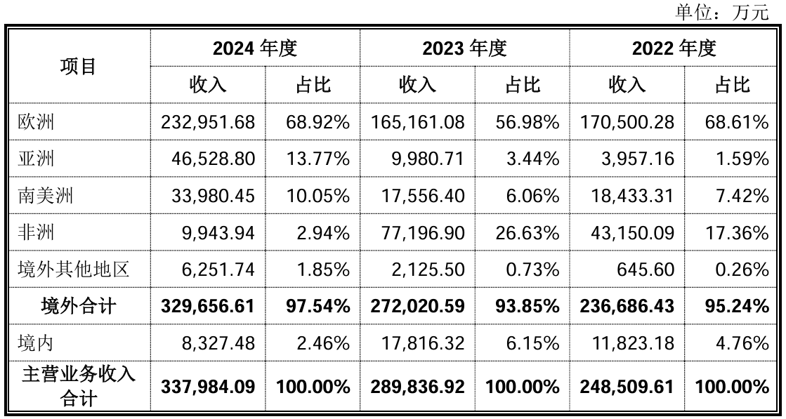 而在非洲市场公司更是遭遇滑铁卢,2024年来自于非洲市场的收入同比减少87.12%。公司解释称主要是南非市场2023年因电力短缺因素驱动下销售收入显著增长,但随着2024年电力短缺问题缓解,叠加市场竞争加剧、主要客户产销策略调整等因素,该地区出货量出现回落。