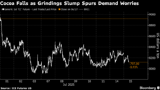 纽约最活跃合约一度下跌2.6%,至每吨8076美元。马来西亚可可局和可可制造商协会周二报告称,作为亚洲第二大可可加工国,马来西亚第二季度可可豆加工量同比下滑22%。