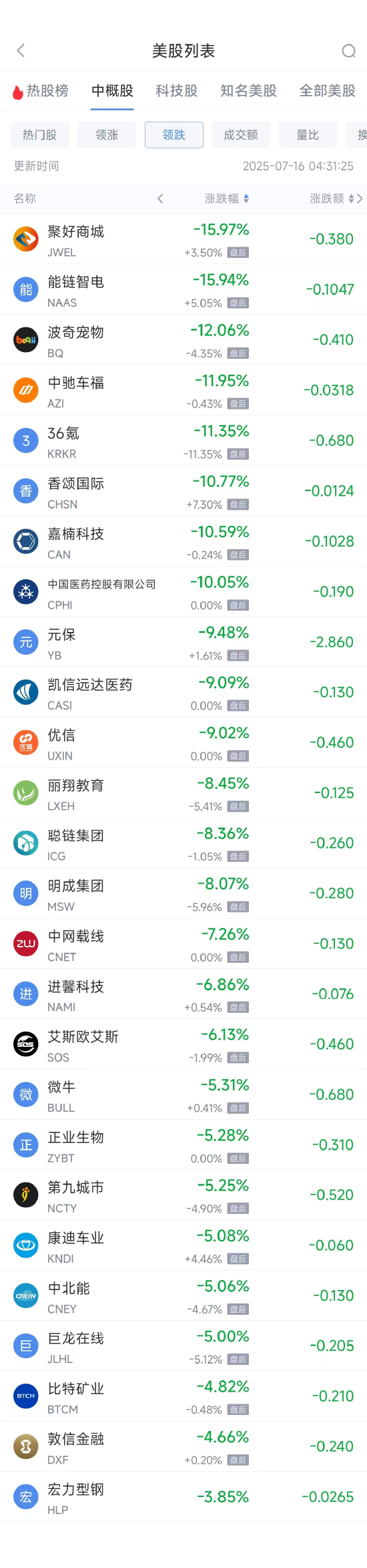 领跌中概股列表: