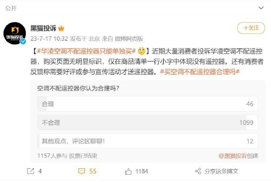 《5D调查》搜索发现,在黑猫投诉平台上,针对华凌“安装服务不及时”、“维修收费不透明”等的投诉累计超3000条。据了解,自2021年起,华凌空调取消标配实体遥控器,改为手机蓝牙或微信小程序控制。消费者在购买后才发现需额外付费购买遥控器(29元/个)或通过晒单好评免费领取。此举引发大量投诉,黑猫平台相关投诉超百条。消费者抱怨道,“谁能想到开个空调还要先找到手机,再打开蓝牙、搜索小程序,有时候距离远一点还连不上。平时我上班只有老人在家,他们不会使用智能手机,难道连用空调的权利都没有了吗?”