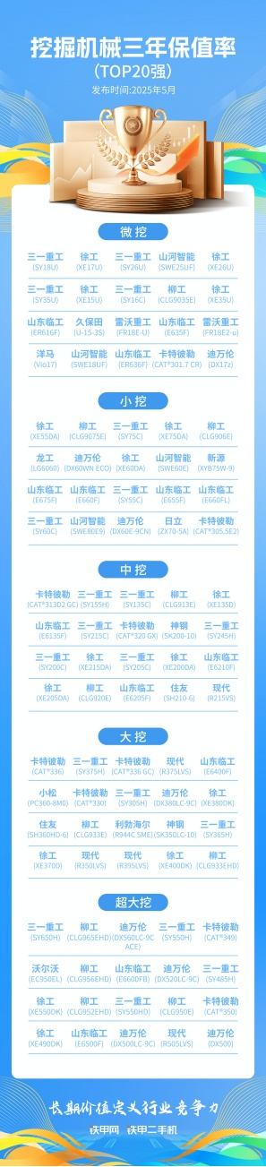 铁甲网挖掘机三年保值率榜单,凭借权威数据与科学算法,为工程机械行业带来全新价值评判标准,助力主机厂、用户及企业实现价值提升与决策优化。未来,铁甲网将持续深耕数据研究,完善保值率评估体系,为行业可持续发展贡献力量。