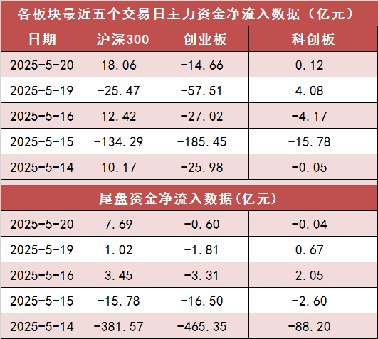 今日(5月20日)沪深两市主力资金开盘净流出67.28亿元,尾盘净流入4.68亿元,两市全天资金净流出19.3亿元。