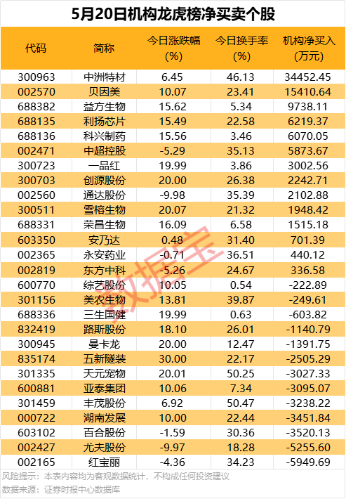5月20日龙虎榜中,共14股获机构净买入,中洲特材获净买入3.45亿元,居首;其次是贝因美(002570),获净买入1.54亿元。