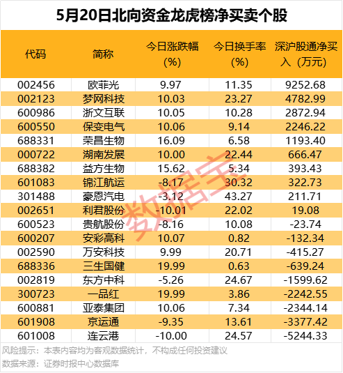 今日龙虎榜现身个股中,5股获北向资金净买入超千万元,欧菲光(002456)获净买入9252.68万元,居首。北向资金净卖出居首的是连云港(601008),金额为5244.33万元。