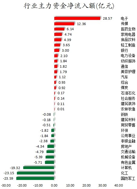从行业来看,申万所属的31个一级行业,今日有18个行业主力资金呈现净流入,其中,电子行业主力资金净流入最多,净流入金额为28.57亿元;行业主力资金净流入居前的还有传媒、医药生物、家用电器、食品饮料、轻工制造等,净流入金额分别为12.36亿元、6.14亿元、4.74亿元、4.39亿元、3.65亿元。13个行业主力资金呈现净流出,其中,国防军工行业主力资金净流出最多,净流出金额为23.59亿元;行业主力资金净流出靠前的还有化工、计算机、有色金属等,净流出金额分别为23.15亿元、19.32亿元、5.71亿元。