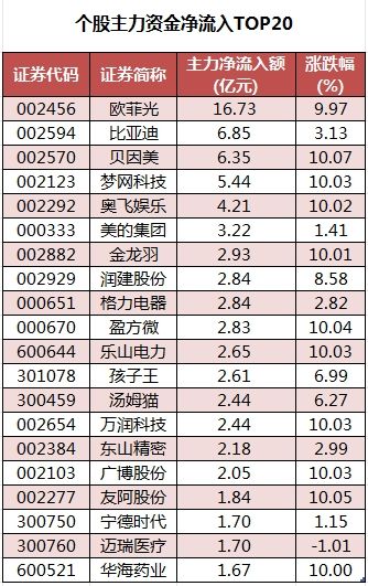 个股来看,今日有2319只个股获主力资金净流入,其中,48股获主力资金净流入超1亿元。欧菲光主力资金净流入最多,净流入金额为16.73亿元;主力资金净流入居前的个股还有比亚迪、贝因美(002570)、梦网科技、奥飞娱乐(002292)、美的集团(000333)等,净流入金额分别为6.85亿元、6.35亿元、5.44亿元、4.21亿元、3.22亿元。