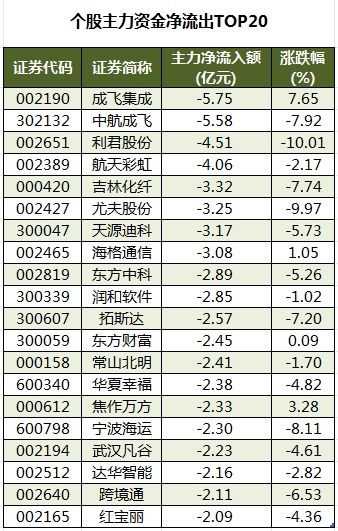 今日有2807只个股被主力资金净卖出,其中,50股被主力资金净卖出超1亿元。主力资金净流出最多的个股是成飞集成,净流出金额为5.75亿元;主力资金净流出居前的个股还有中航成飞、利君股份(002651)、航天彩虹(002389)、吉林化纤(000420)、尤夫股份等,净流出金额分别为5.58亿元、4.51亿元、4.06亿元、3.32亿元、3.25亿元。