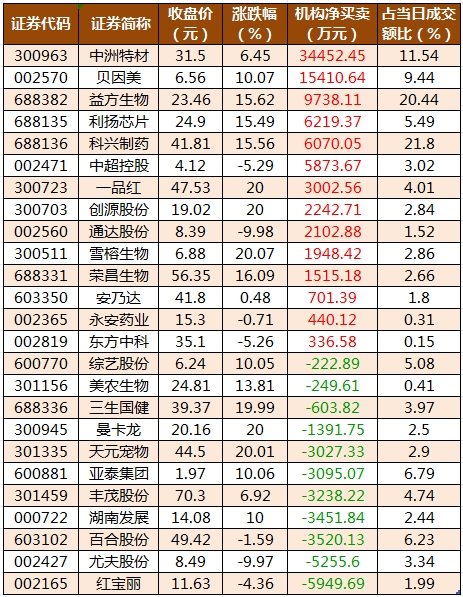 盘后龙虎榜数据显示,今日机构席位资金合计净买入约6亿元。其中,净买入的个股14只,净卖出的个股11只。机构净买入最多的股票是中洲特材,净买入金额约3.45亿元;机构净买入居前的还有贝因美、益方生物、利扬芯片等股。机构净卖出最多的股票是红宝丽,净卖出金额约5949.69万元;机构净卖出居前的还有尤夫股份、百合股份等股。