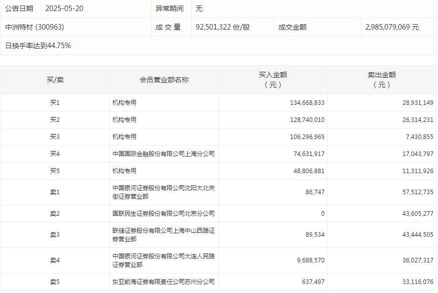 中洲特材今天涨6.45%。盘后数据显示,4家机构出现在龙虎榜单上,合计净买入3.45亿元;中国国际金融股份有限公司上海分公司买入7463.19万元,同时卖出1704.38万元;中国银河(601881)证券股份有限公司大连人民路证券营业部买入968.86万元,同时卖出3602.73万元。