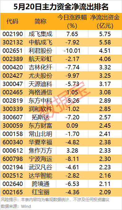 此外,还有航天彩虹(002389)、吉林化纤(000420)、尤夫股份、天源迪科(300047)、海格通信(002465)等热门股主力资金净流出金额居前。