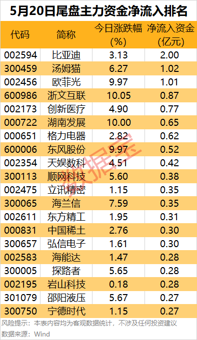 3股尾盘获主力资金大幅加仓,净流入均超1亿元,分别是比亚迪(002594)、汤姆猫(300459)、欧菲光(002456)。