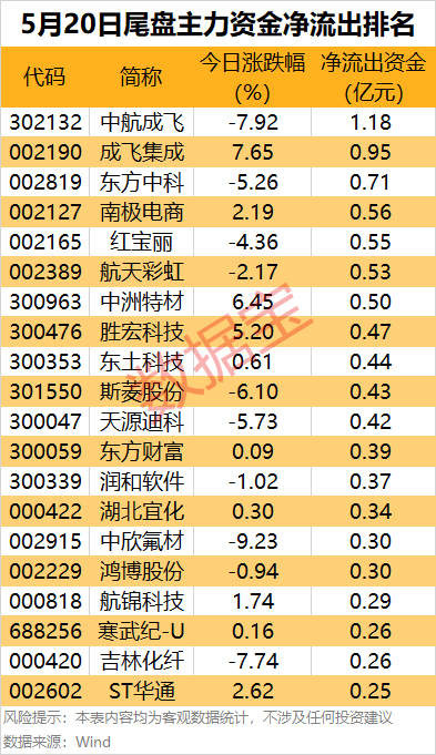 中航成飞尾盘主力资金净流出金额居首,为1.18亿元。此外,还有成飞集成、东方中科(002819)、南极电商(002127)、红宝丽(002165)等尾盘净流出金额居前。