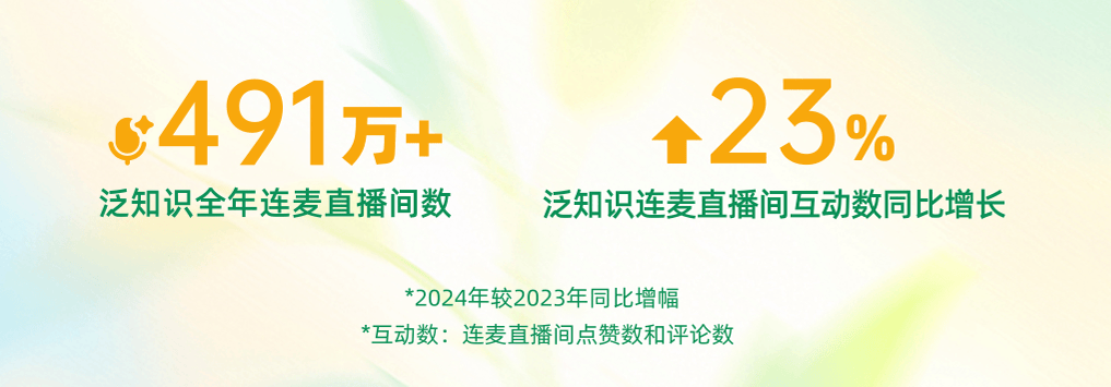 随着用户互动与创作者投稿形成正向循环,推动生态双向繁荣,连麦学习正重塑知识普惠的全新范式。数据显示,2024年,快手泛知识连麦直播场次达491万场,直播间互动量同比提升23%,健康咨询、教育助学、法律咨询位列连麦内容前三。