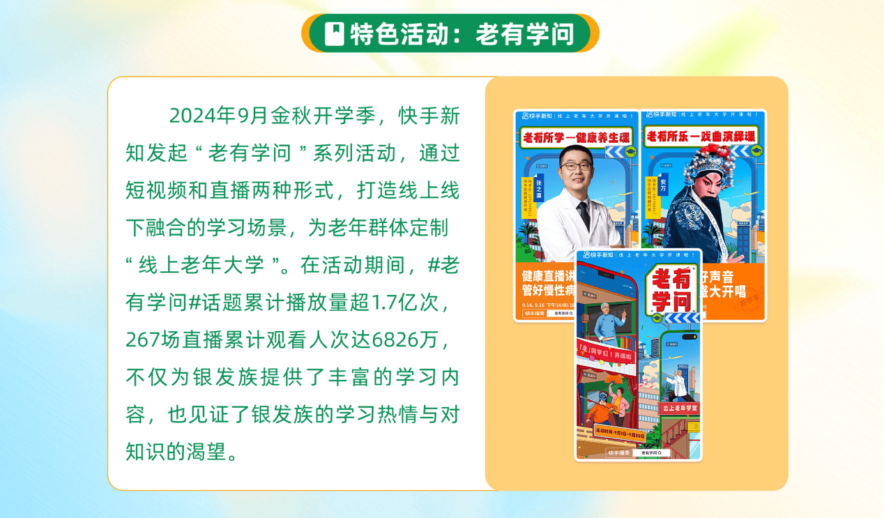 值得一提的是,?为响应银发学习热潮?,2024年金秋开学季,快手新知推出“老有学问”系列活动,打造戏曲演艺课、健康养生课、法律普法课等多样化课程的“线上老年大学”,活动累计播放量超1.7亿次, 267场直播累计观看人次达6826万。