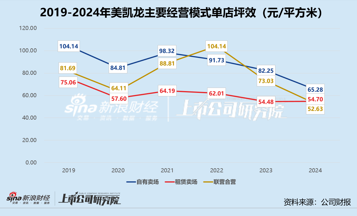 换而言之,除了自有卖场有小幅增量,美凯龙的其他经营模式都在缩减。2024年,公司自有、租赁和联营合营卖场的平均实际单位面积经营收入分别为65.28元/平方米、54.70元/平方米、53.63元/平方米,其中租赁卖场绩效同比实现0.4%微增,自有和联营合营卖场与2023年绩效相比降幅均超过20%。对比历史表现,自有和租赁卖场平均实际单位面积经营收入从2019年的104.14元/平方米、75.06元/平方米一路下滑,累计跌幅分别达37.3%、27.1%。联营合营卖场2022年绩效曾一度高达104.14元/平方米,短短两年内已经“腰斩”。
