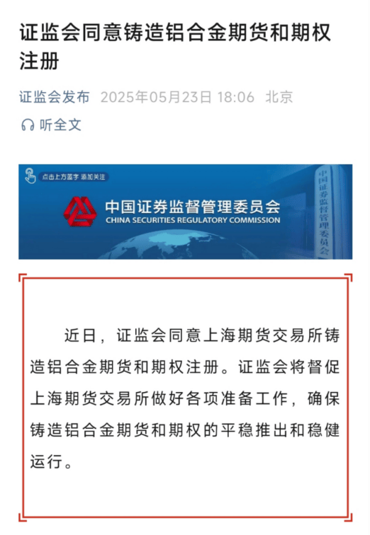 中国证监会近日同意上海期货交易所(下称上期所)铸造铝合金期货及期权注册,标志着我国期货市场首个再生金属品种即将上市。证监会要求上期所做好各项准备工作,保障铸造铝合金期货及期权平稳运行和健康发展。