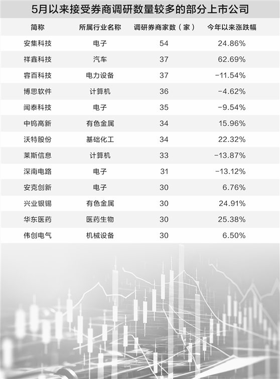 东方财富Choice数据显示,电子成为5月以来券商最高频调研的行业,有超90家上市公司成为券商调研对象。其中,安集科技(688019)、闻泰科技(600745)、深南电路(002916)、安克创新、希荻微、汉朔科技等公司均接受不少于25家券商扎堆调研。
