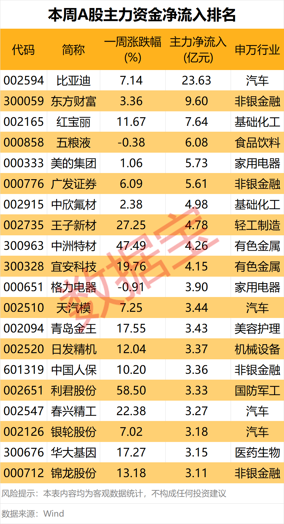 个股方面,本周104股主力资金净流入均在1亿元以上。比亚迪(002594)主力资金净流入居首,高达23.63亿元;其后是东方财富(300059)、红宝丽(002165)、五粮液(000858)、美的集团(000333)、广发证券(000776)等个股,主力资金净流入均在5亿元以上。
