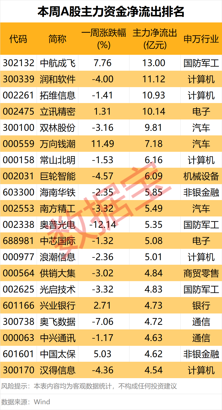 净流出方面,本周272股主力资金净流出均在1亿元以上。中航成飞、润和软件(300339)、拓维信息(002261)、立讯精密(002475)排名前四,主力资金净流出依次为13亿元、11.12亿元、10.93亿元、10.14亿元。