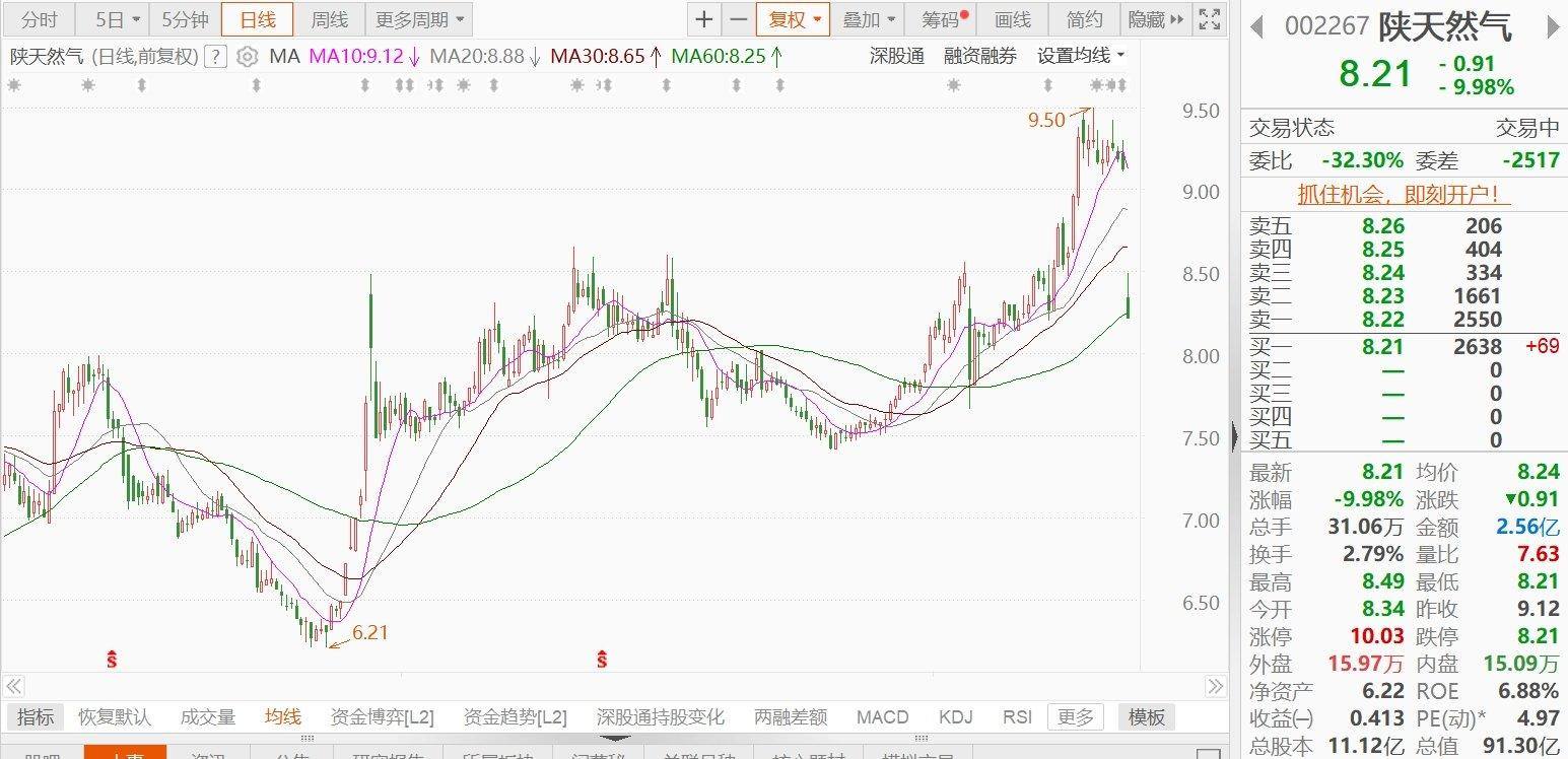 A股陕天然气触及跌停,6月1日起,公司省内管道运输价格每立方米将降低3.86分!预计2025年净利润减少2.23亿