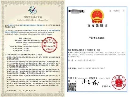 ▲“宇宙中心万家丽”国际顶级域名证书和商标注册证