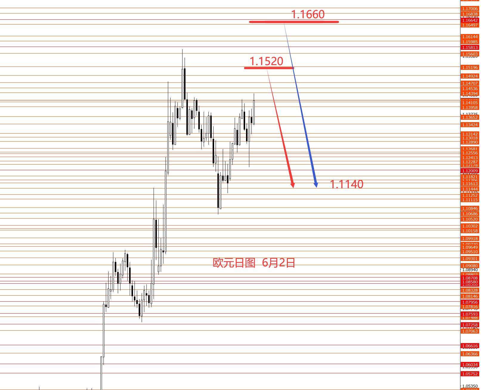 欧元上周1.1420承压下行,目标位1.1220也到位,走了周一分析的蓝线备选方案。从图形来看,虽然到达1.1220后得以支撑再次向上运行,五月收线也较高,但大的框架仍是宽幅震荡格局。欧元从1月13日底部出现到3月3日震荡格局结束并上破位,拉涨至1.1580,仅用了一个多月,所以从节奏分析来看,目前高位震荡修整时间周期不够,所以后市仍按高位宽幅震荡格局操作,这是大框架。细节就是确定这波高点位置,目前不确定高点位置,重点可以关注1.1520和1.1660,极限1.1710区域概率较小。等待涨不动给出向下信号后,可右侧进场做空,抓向下波段行情,下方目标1.1140区域,按宽幅震荡格局操作。本周初目前短线还是上涨趋势,这个波段的顶部到底在哪里,还要再继续等待。今日框架思路仅供参考,风险自负。