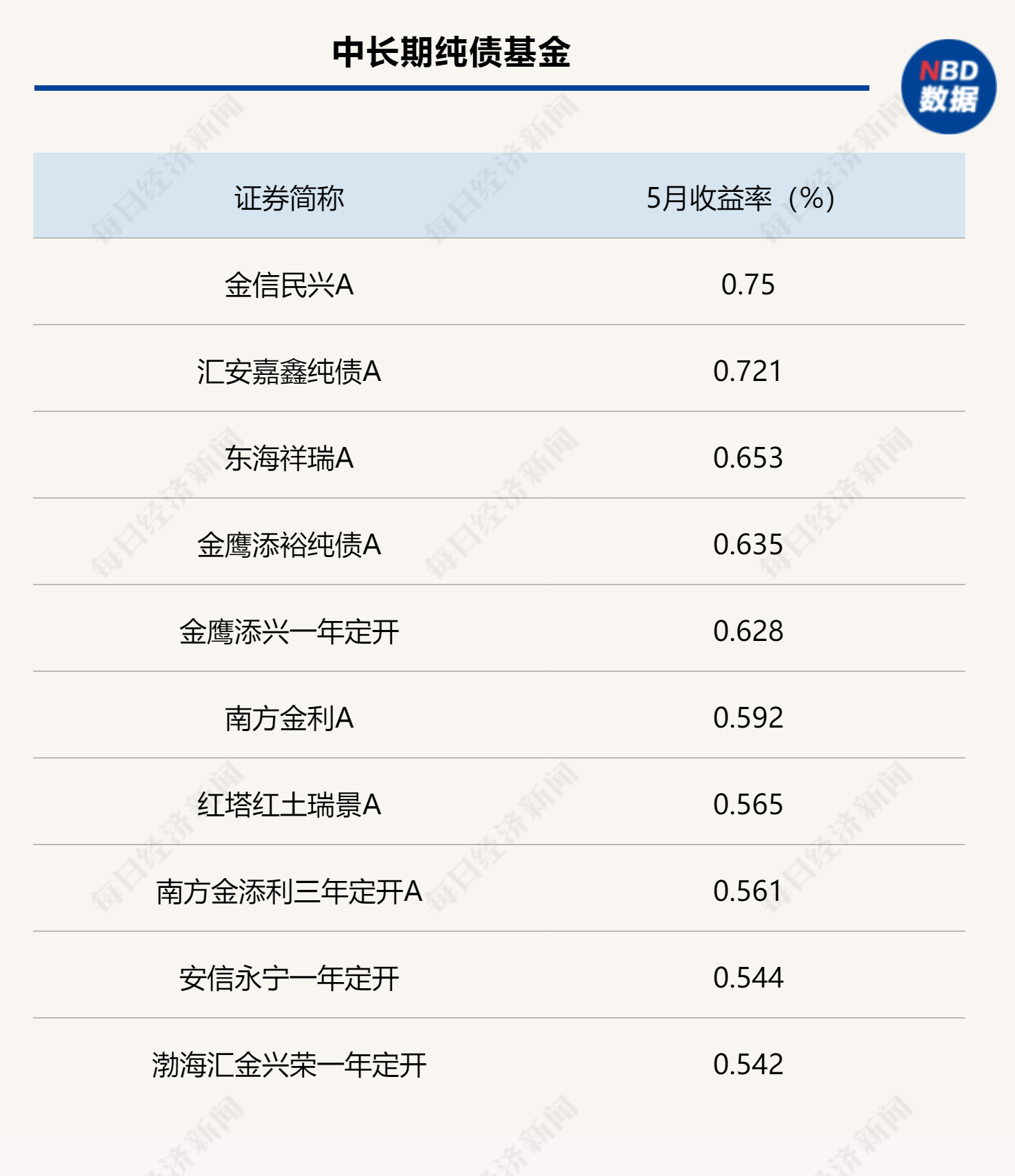 Wind统计显示,5月的头部业绩产品当中,纯债基金里的金信民兴A表现较优,录得0.75%的月度收益率,还有汇安嘉鑫纯债、东海祥瑞A、金鹰添裕纯债A等月度业绩排名居前。从基金的类型来看,中长期纯债基金的头部业绩明显好于短债类基金。