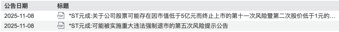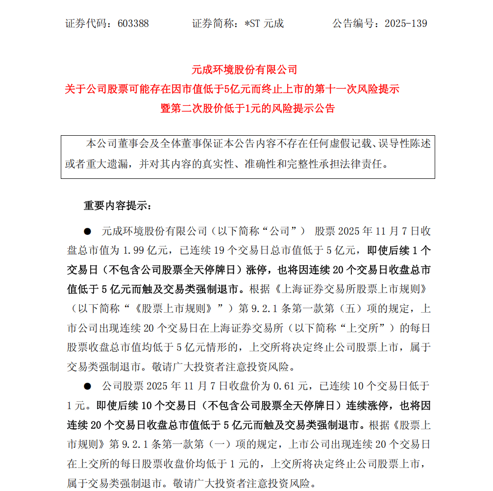 此外,公司股票2025年11月7日收盘价为0.61元,已连续10个交易日低于1元。即使后续10个交易日(不包含公司股票全天停牌日)连续涨停,也将因连续20个交易日收盘总市值低于5亿元而触及交易类强制退市。截至11月7日收盘,*ST元成股价跌4.69%,最新市值为2亿元。