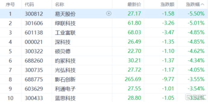 消费电子板块下跌,易天股份、绿联科技跌超5%,工业富联、深科技、硕贝德、昀冢科技、光弘科技等多股跟跌。