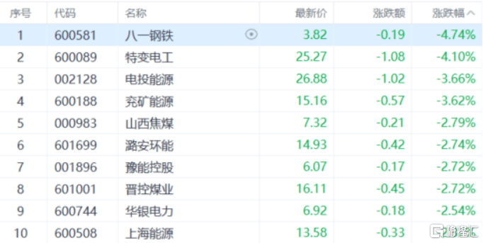 煤炭板块下跌,八一钢铁、特变电工跌超4%,电投能源、兖矿能源跌超3%,山西焦煤、潞安环能、豫能控股等多股跟跌。