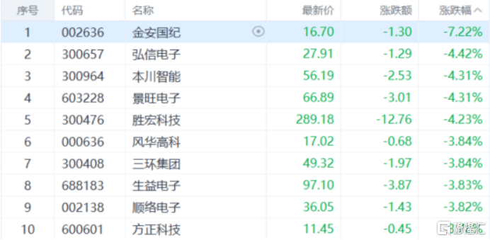 元件板块走弱,金安国纪跌超7%,弘信电子、本川智能、景旺电子、胜宏科技跌超4%,风华高科、三环集团、生益电子等多股跟跌。