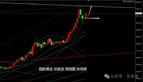 但上周未能进一步跌破10周均线支撑,并收取止跌形态,暗示的本周有止跌反弹重回5周均线上方转强再攀升的倾向的得到验证;布林带也再度向上延伸,5-10周均线也转为支撑,目前将继续维持低多操作,待上看4340美元或更高位置。