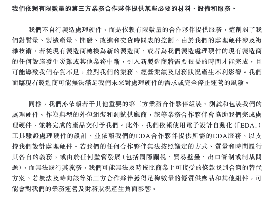 但令人担忧的是,奕斯伟计算的处理硬件对第三方存在较强依赖。据招股书披露,奕斯伟计算“不自行制造处理硬件,而是依赖有限数量的合作伙伴提供服务,这削弱了我们对质量、制造产量、开发、改进和交货时间表的控制”。同时,奕斯伟计算在处理硬件的组装、测试、包装及设计环节也都依赖第三方合作伙伴。